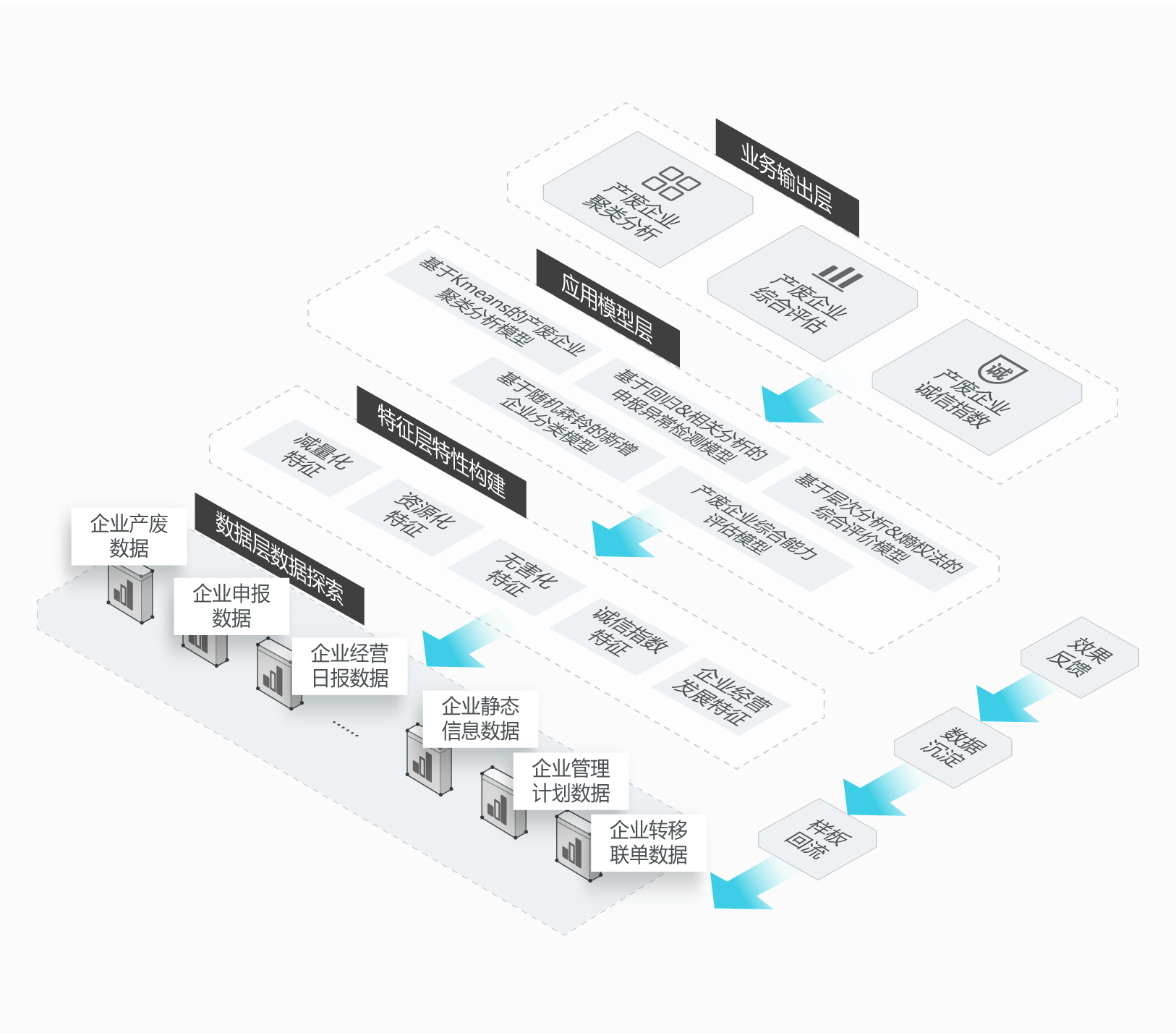 從減量化、資源化、無害化、誠信指數、企業經營發展能力五方面綜合評估產廢、處廢企業,建立企業評分模型。