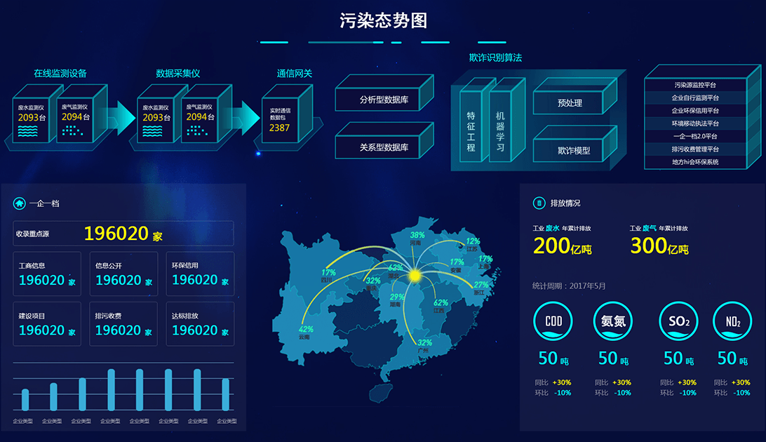 ET環境大腦提供全景式生態環境形勢研判模式,加強生態環境質量、污染源、污染物、環境承載力等數據的關聯分析和綜合研判,強化經濟社會、基礎地理、氣象水文和互聯網等數據資源融合利用和信息服務。