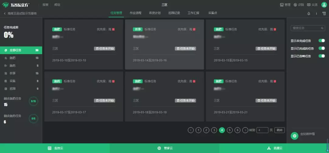 如今,五大村的蜜瓜基地在五谷耘立方標準化生產(chǎn)系統(tǒng)的管理下,井然有序地進行著各項生產(chǎn)任務(wù),基層工作人員每天都會收到系統(tǒng)自動派發(fā)的農(nóng)事任務(wù)流程,以及基地管理員派發(fā)的臨時工作任務(wù),并且每完成一項任務(wù),工作人員在系統(tǒng)上直接匯報,基地管理員在系統(tǒng)中可以實時查看工作完成情況,及時掌握農(nóng)事進度。