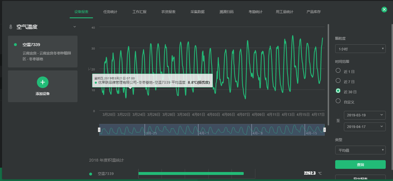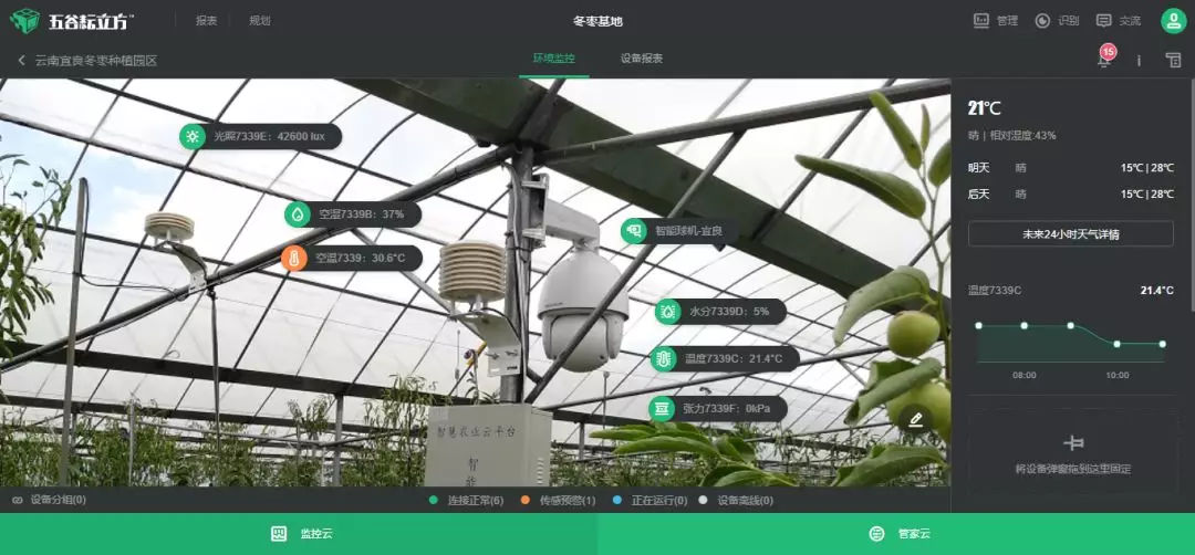 為了保障技術員的農事操作標準化,高度把控冬棗生長環境,天潤智力農技服務團隊在大棚內安裝全方位的物聯網監控設備,對棚內的空氣溫濕度、光照度、大氣壓力,土壤張力、土壤溫濕度進行24小時不間斷監控,維持大棚內環境的平衡穩定。另外當某個數據超過或低于預設的闕值,系統會自動預警,提醒工作人員采取相應措施,避免意外發生。