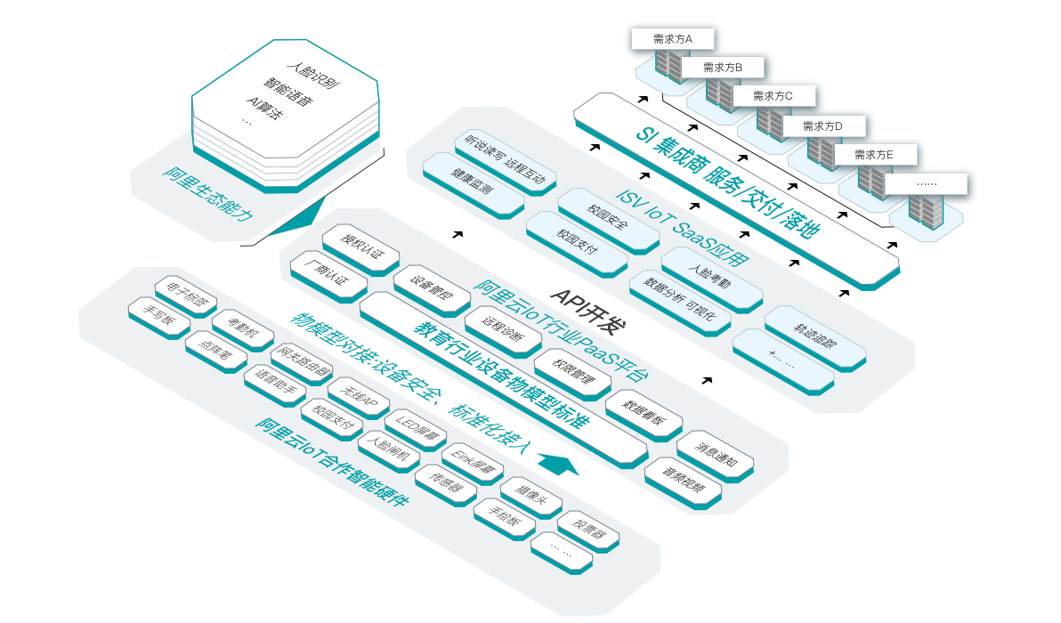 阿里云IoT基礎平臺,支撐校園設備穩定可靠接入,方便IHV跟ISV之間高效對接流轉,減少管控運維成本。阿里生態能力支撐ISV應用快速低成本形成場景解決方案,服務學校、機構、SI等不同需求方。通過Link Market應用市場,幫助SI快速找到需要的應用。