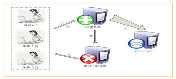 與CMS(內容發布系統)聯動掃描模式網站錯別字監測平臺提供與CMS發布系統結合的WebService接口,國內常見的CMS系統均可與G-ONE錯別字系統實現良好的對接。網站編輯人員可在信息編輯完成后,先提交給錯別字服務器審核,如檢測到錯誤,則返回修改;如無錯誤,則發布至web服務器。