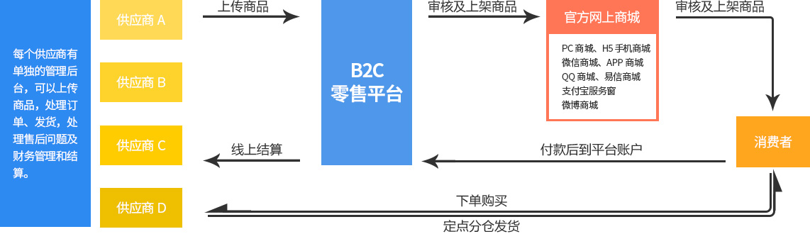 多供應商零售電商解決方案,主要是幫助企業打通上游供應鏈,整合已有的資源優勢,結合線上全渠道銷售通道,構建一個智能化的零售商業生態圈。0倉儲成本,定點發貨,是企業零售運營的新模式。