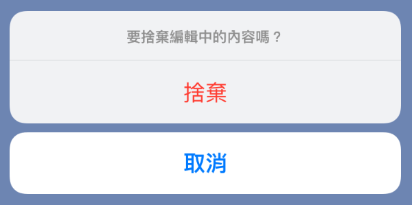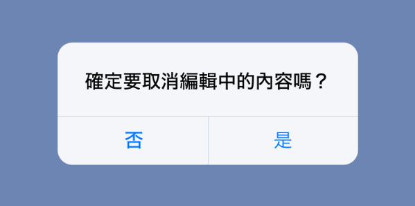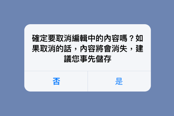 看過上面這些討論,我們可將這個警告框的說明文字中的「確定要取消編輯中的內(nèi)容嗎?」改寫成「要舍棄編輯中的內(nèi)容嗎?」