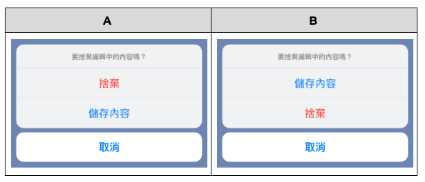 在這個語境中,系統(tǒng)向使用者確認(rèn)是否同意執(zhí)行「取消編輯中的內(nèi)容」。大部分同意執(zhí)行的使用者,可能會直覺地按下相同文字的「取消」按鈕。可是這樣的話并不會取消編輯。