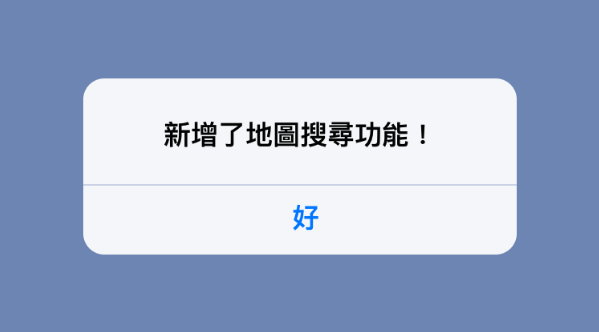 有的時候警告框只是用來傳達(dá)訊息,比如在說明新功能的時候,會用到只有一個按鈕的警告框。我們可想想在這種時候該如何設(shè)計按鈕的文字。一般來說,使用「OK(好)」雖然沒有問題,但在不同的語境中也有可能需要改成其他文字。