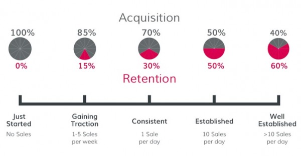 在了解了顧客獲取和留存各自的重要性,我們可以開始研究要怎么分配預算。我們必須讓這件事同時進行,會變動的只有分配在上面的金額。你的分配策略應該或由兩個因素主導:商店的生命周期和產品的定位。