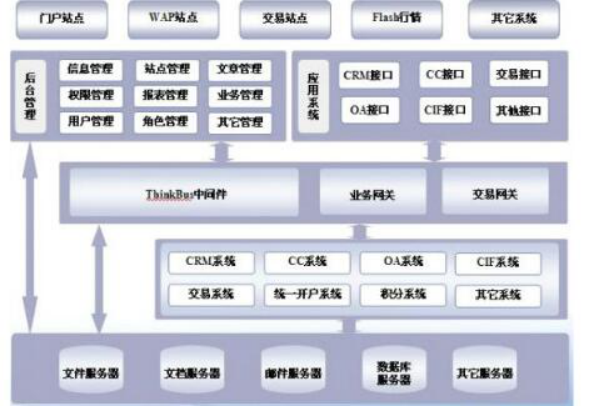 一般來說,證券公司現有的網站系統都包括交易系統,CRM系統,咨詢數據庫,OA辦公等資源進入網站,通過ThinkBus中間技術來實現這一過程。