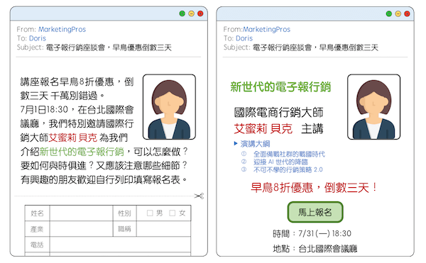很顯然,右邊的電子郵件更能幫助有興趣的人快速掌握主題,并且讓他們在理解重點之后,選擇是否要進一步閱讀相關的詳細資訊。