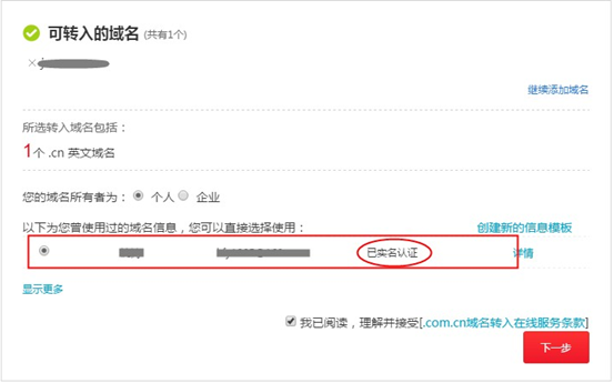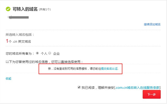 4、在進(jìn)行域名轉(zhuǎn)入操作時(shí),必須選擇一個(gè)“已實(shí)名認(rèn)證”狀態(tài)的信息模板,才可提交 轉(zhuǎn)入并進(jìn)行支付。
