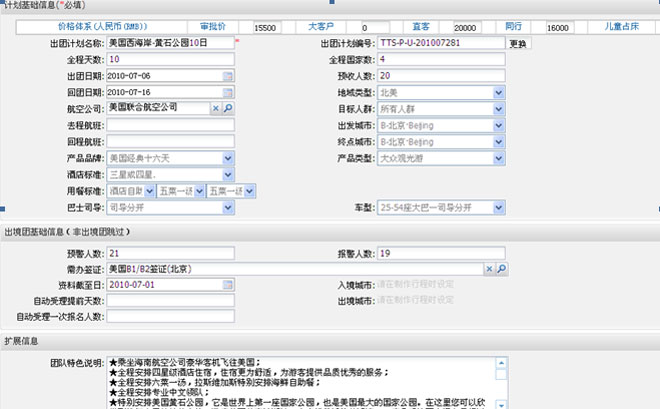 產品屬性:包括產品特色、旅游目的地、接待要求、產品價格(大客戶、同行、直客、成人、兒童、嬰兒)