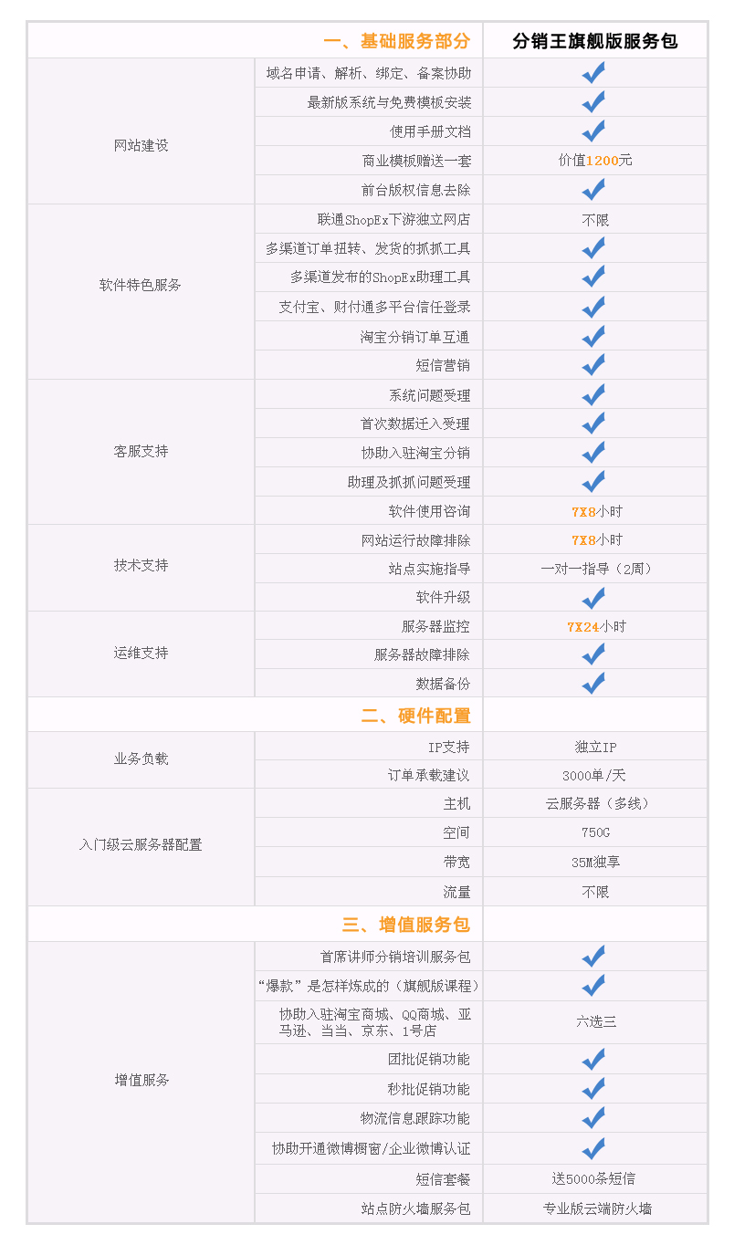 分銷王旗艦版套餐適合擁有自主品牌或者擁有超大規(guī)模在線或線下業(yè)務(wù)的大型公司,提供高端云服務(wù)器和最新版分銷王網(wǎng)上商店系統(tǒng),能滿足您對軟硬件的個性化、高負(fù)載需求。