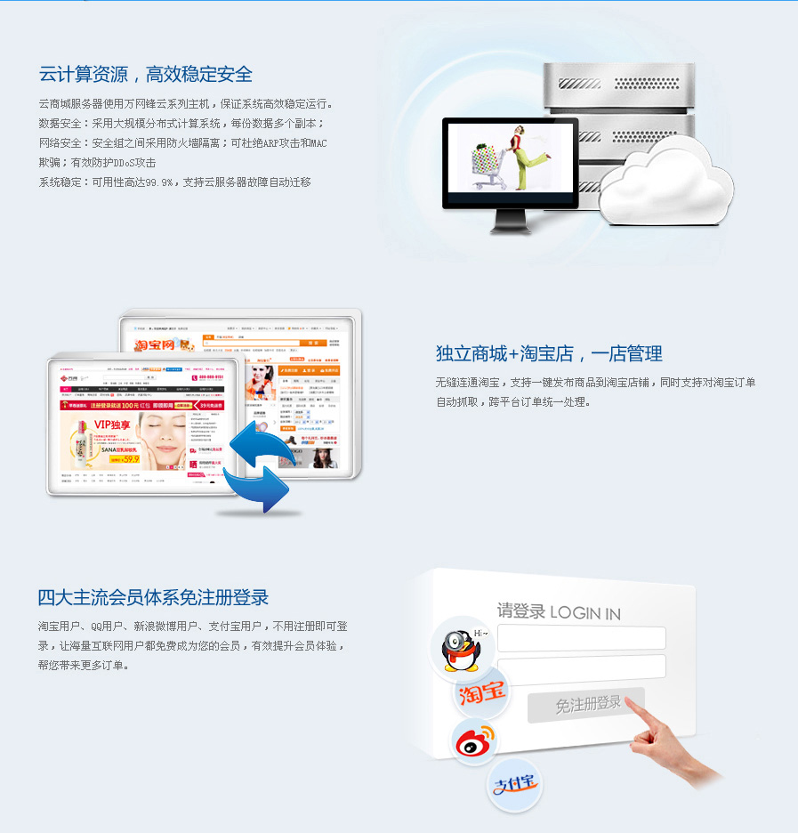 | 其它特色功能 | 打通一淘網 | 可與一淘搜索引擎打通使商品在一淘上出現 |