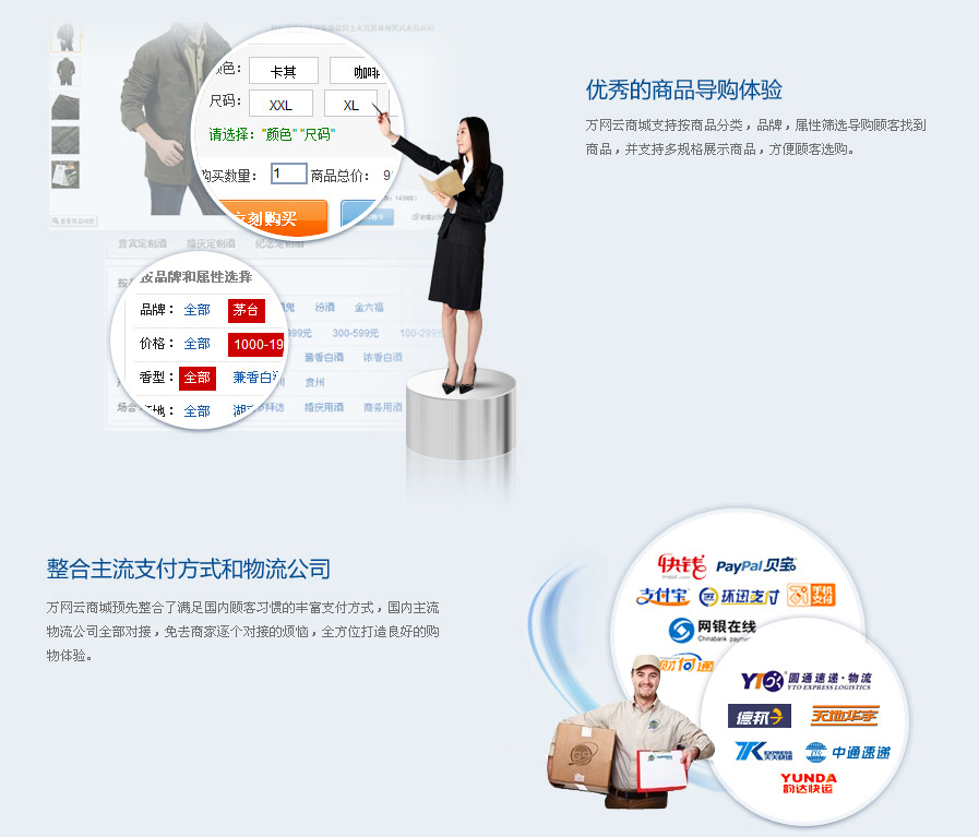 A:此電子商務網站支持多品牌管理,與多級分類管理商品。同時具備對多屬性商品的支持功能,即商品可以根據其不同的屬性(如衣服的尺碼、顏色等)設置不同的價格與庫存等參數,全面支持商家對服飾、數碼產品等多型號、多款式商品的銷售。